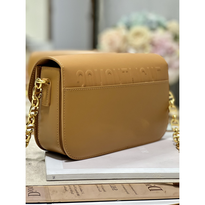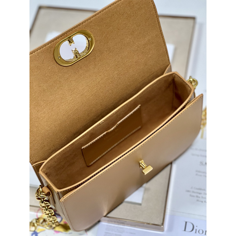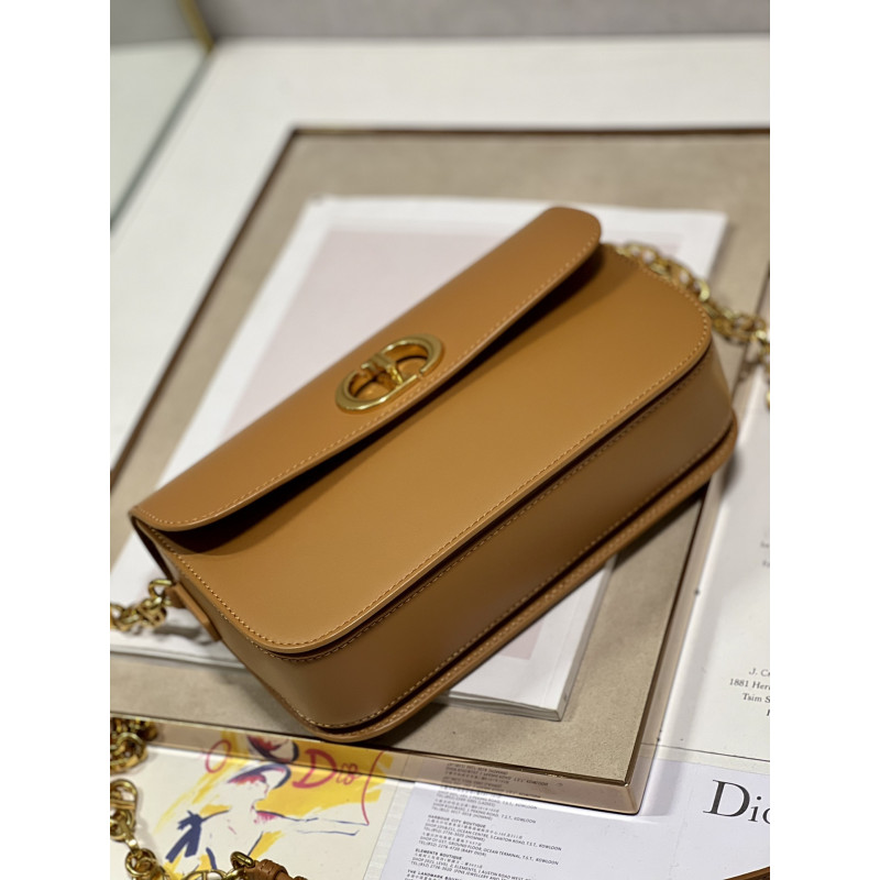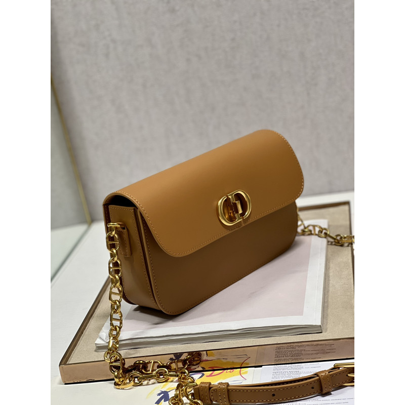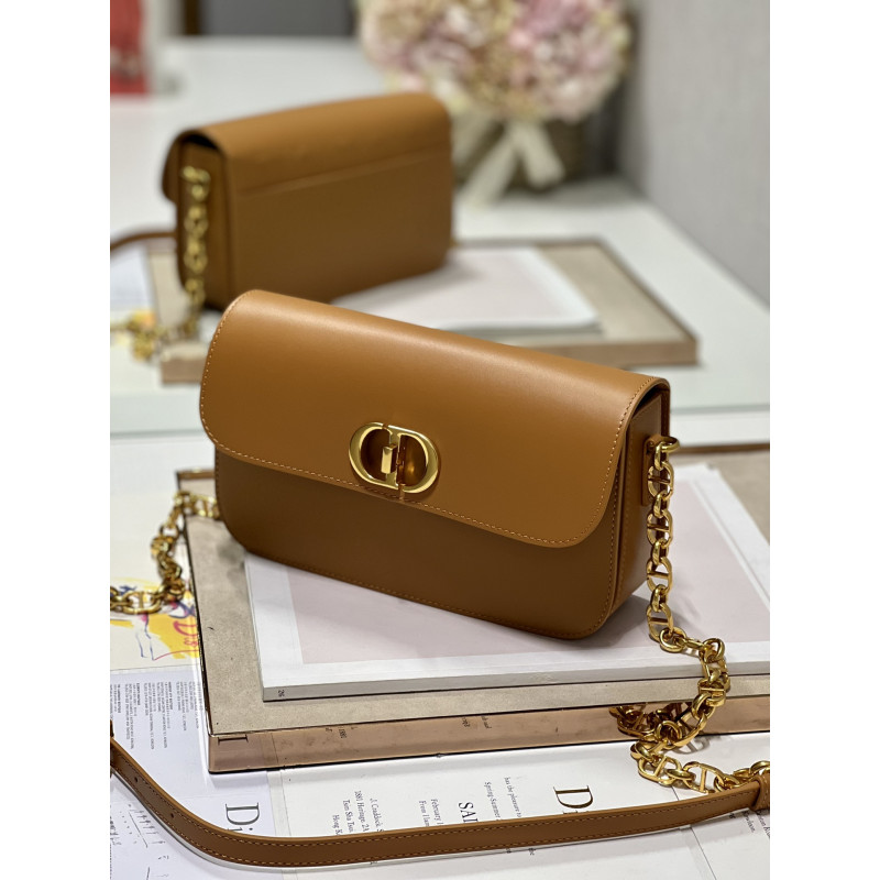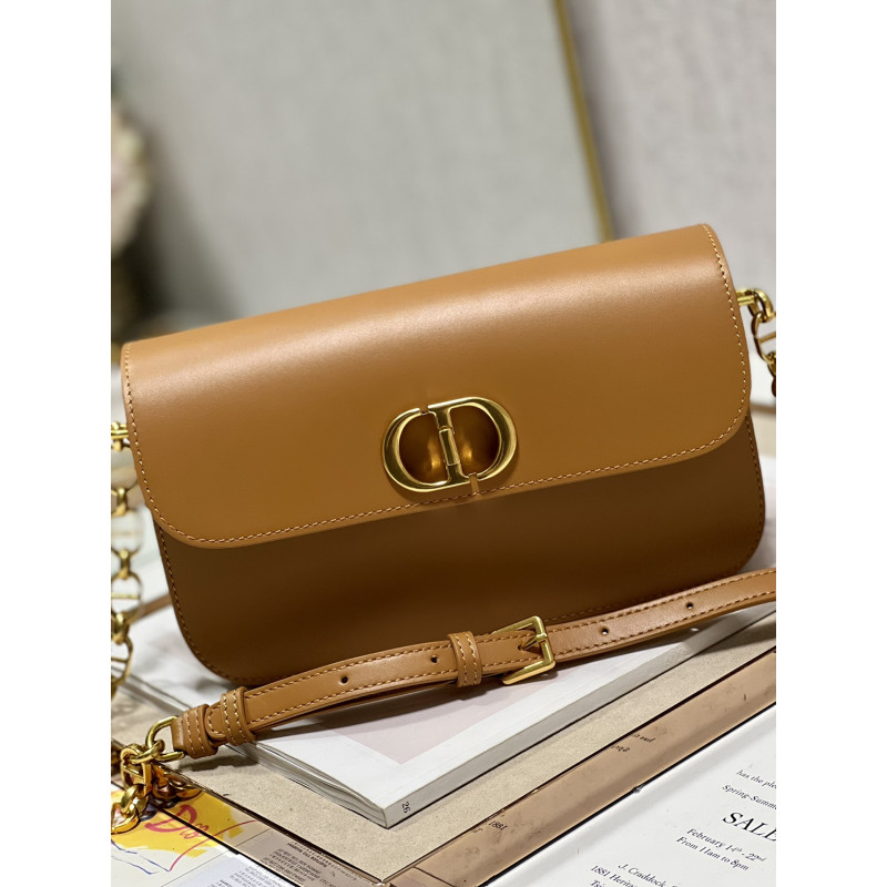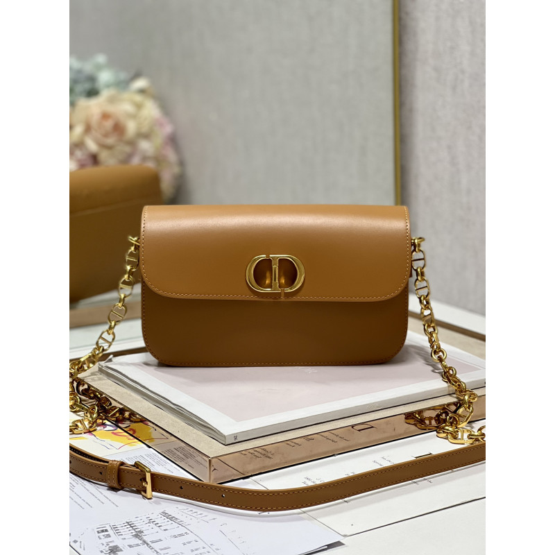 Round flap crafted in calfskin with antiqued gold-plated metal CD clasp, 30 Montaigne logo embossed on the back, and a signature chain with alternating gold-finish metal and tone-on-tone enamel links to match the leather, adjustable. The bag is roomy and refined in shape and can be carried in the hand, over the shoulder or across the body.