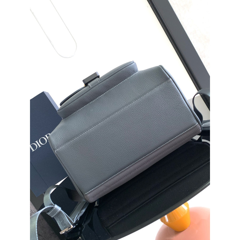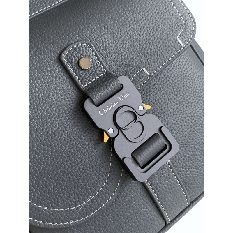 DetailThis saddle flap backpack features a stylish original design that highlights the signature saddle silhouette. Crafted from deep gray grained calfskin with contrasting topstitching, it is adorned with a Dior signature on the front. The spacious interior includes a main compartment for storing daily essentials, while the front saddle flap pocket with an aluminum buckle offers convenient access to items such as a wallet, keys, earbuds, or phone.