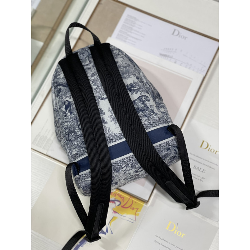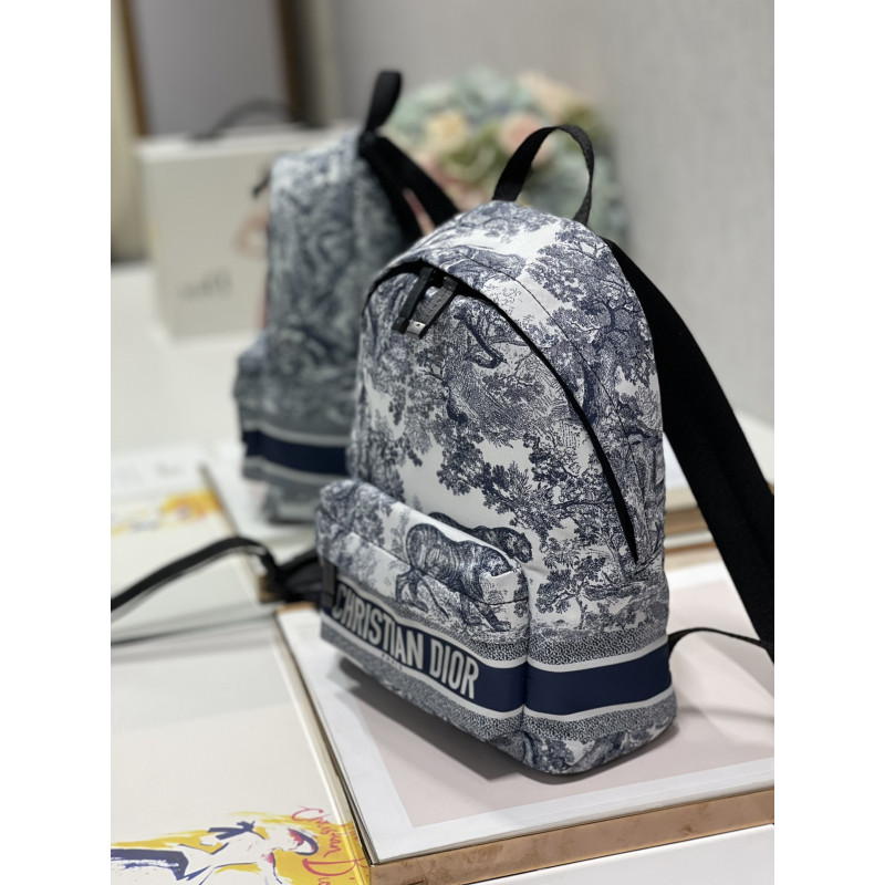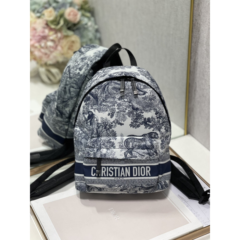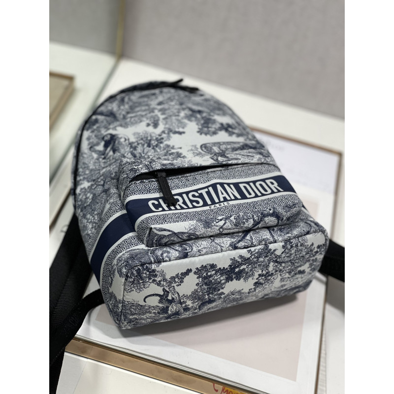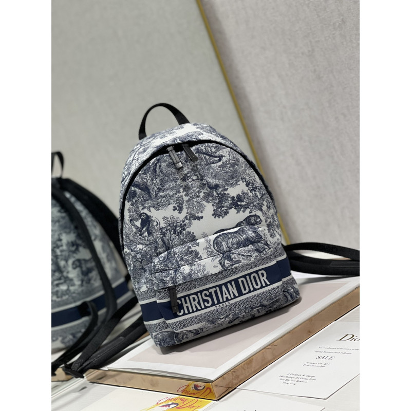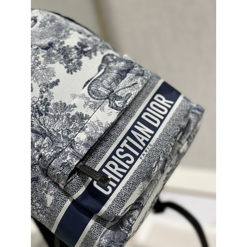 DetailEmbellished with a blue Toile de Jouy print for a contrasting effect. The front is decorated with the 'CHRISTIAN DIOR' logo, with a zipper compartment and external pockets, which can easily store various daily necessities. With an adjustable shoulder strap, it can be carried by hand, on one shoulder or on both shoulders.