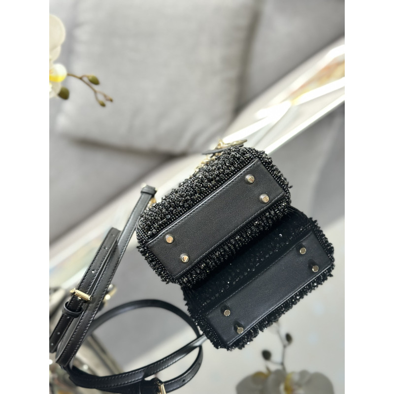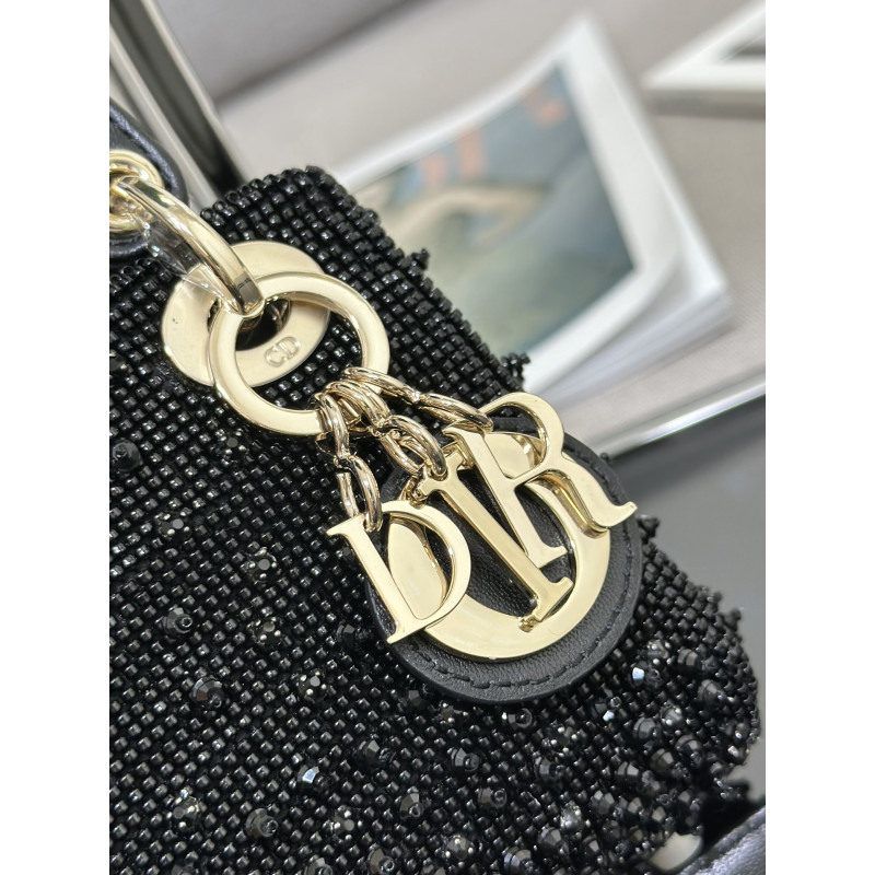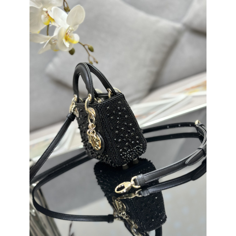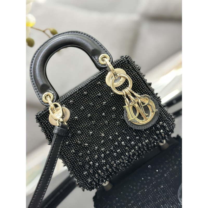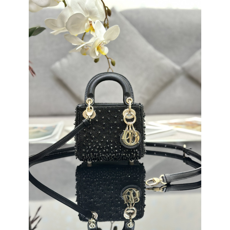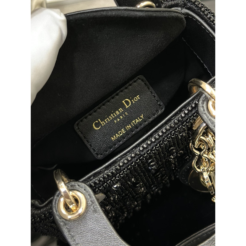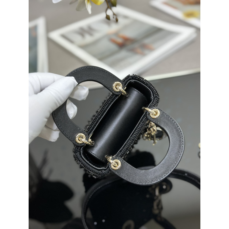 Extra-miniature embroidery beads. Crafted in tonal satin, it's enhanced with ombré-effect beaded embroidery and a D.I.O.R. charm in light gold-finish metal. With a detachable chain shoulder strap and an adjustable, detachable leather shoulder strap, it can be carried by hand, on the shoulder or across the body, making it ideal for everyday or evening looks.