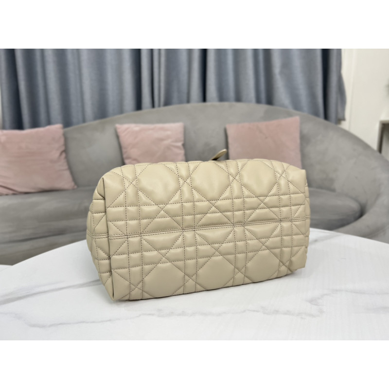 Oversized cannage pattern and the customary CD buckle, unlock the buckle to change from a square bag to a large tote bag,