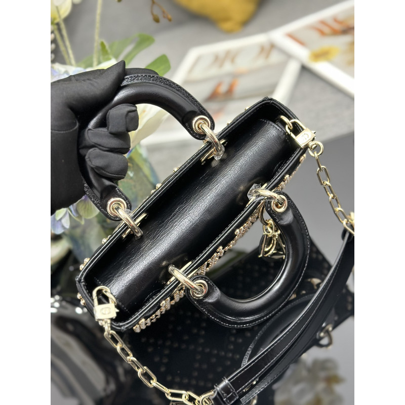 DetailFeaturing tonal mini beadwork in lattice patterns, showcasing Dior's exquisite craftsmanship. Accented with light gold-tone metal D.I.O.R. charms for an elegant silhouette. This compact design includes a detachable chain shoulder strap and adjustable leather strap, ideal for everyday versatility.