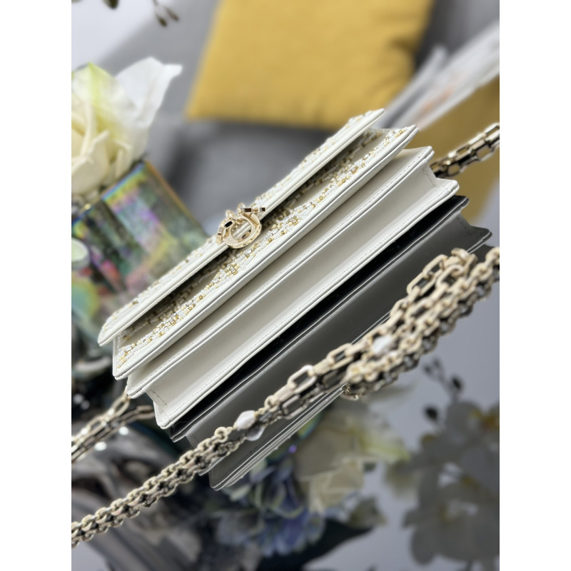 DetailEmbellished with embroidered gold beads, this piece strikes the perfect balance between elegance and practicality. Expertly crafted from leather with cane-pattern topstitching, it features a flap accented with a D.I.O.R. charm. Two compartments and a zip pouch provide ample space for daily essentials, making it a versatile choice for both everyday and evening ensembles.
