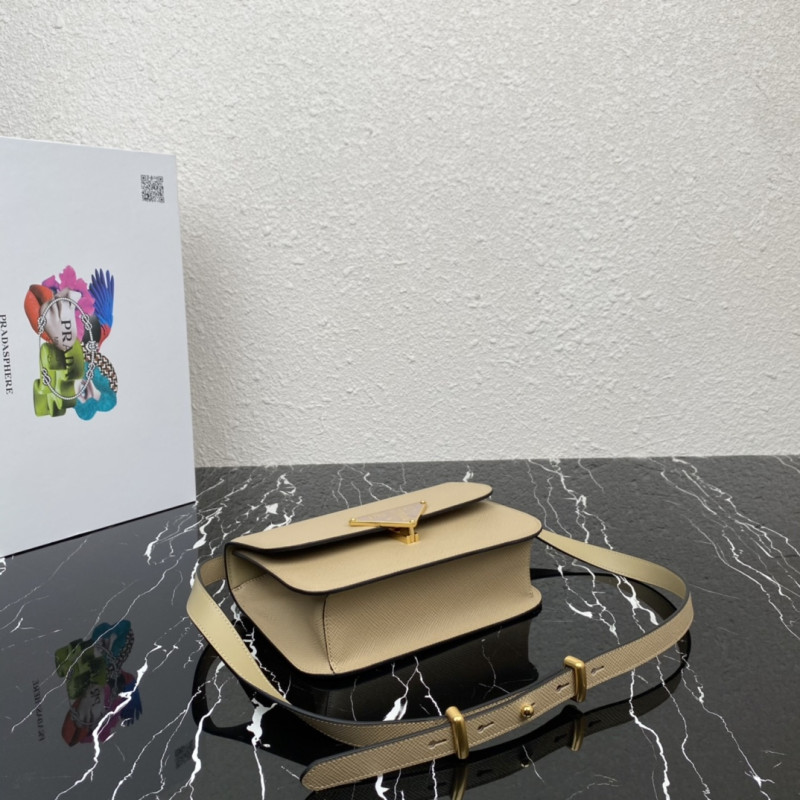 DetailStructured and classically designed in Saffiano leather, this shoulder bag is the brand's signature material, distinguished by its cross-scratch texture and waxed finish. The front is adorned with a triangular logo. Fitted with an innovatively designed handle and an adjustable shoulder strap, this piece is suitable for all occasions.