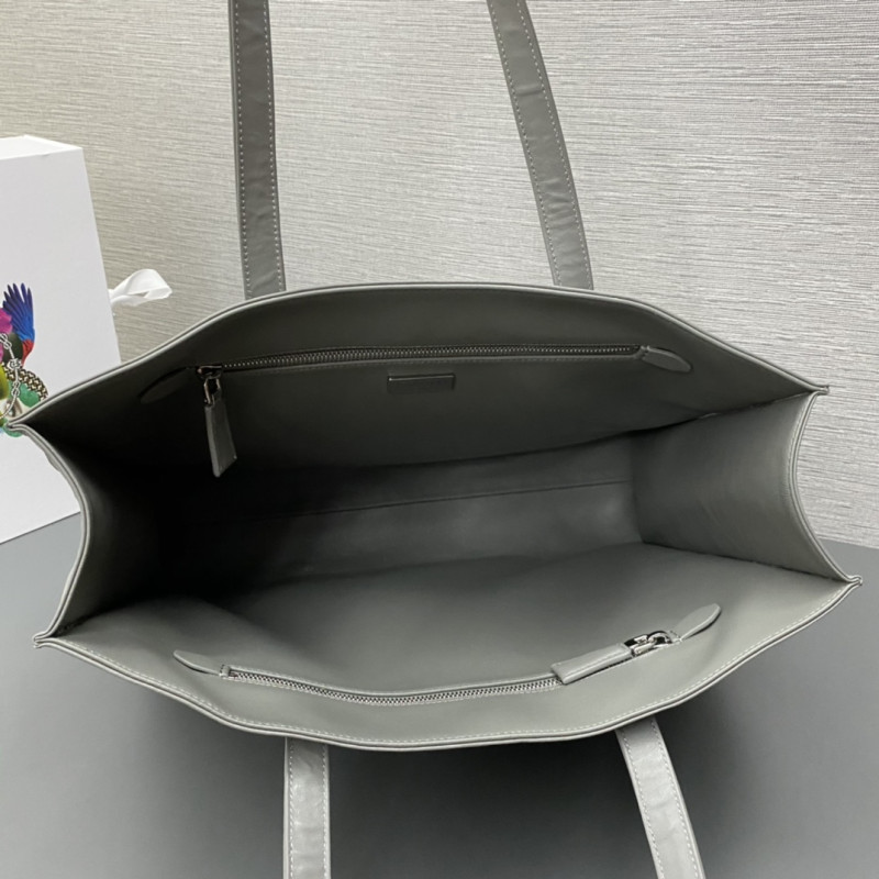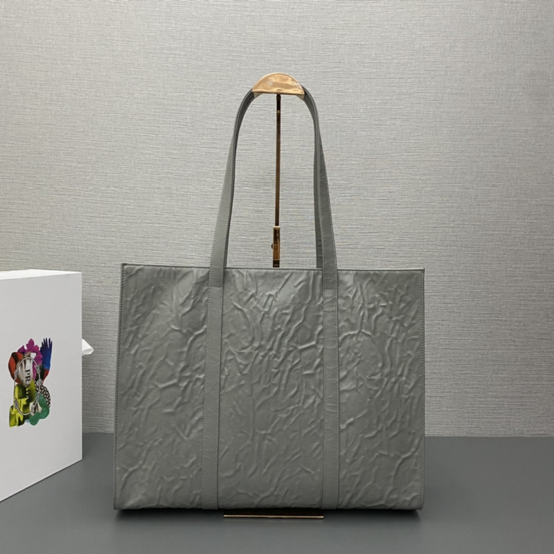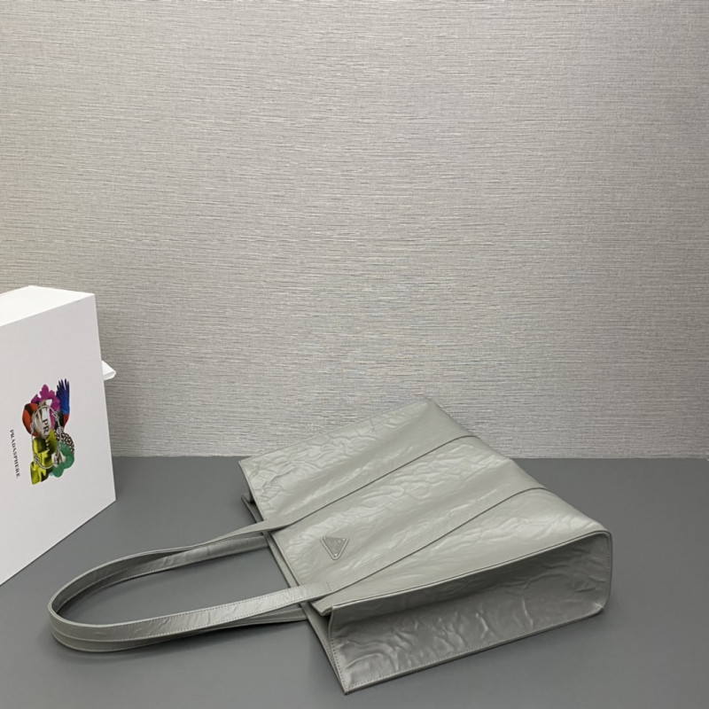 DetailCrafted from natural glossy nappa leather, this tote bag has a casual, everyday appeal. The hand-crafted pleated effect contrasts with the concept of a rigid structure, reinterpreting an everyday item that can be worn casually. Finished with a triangular enameled logo.