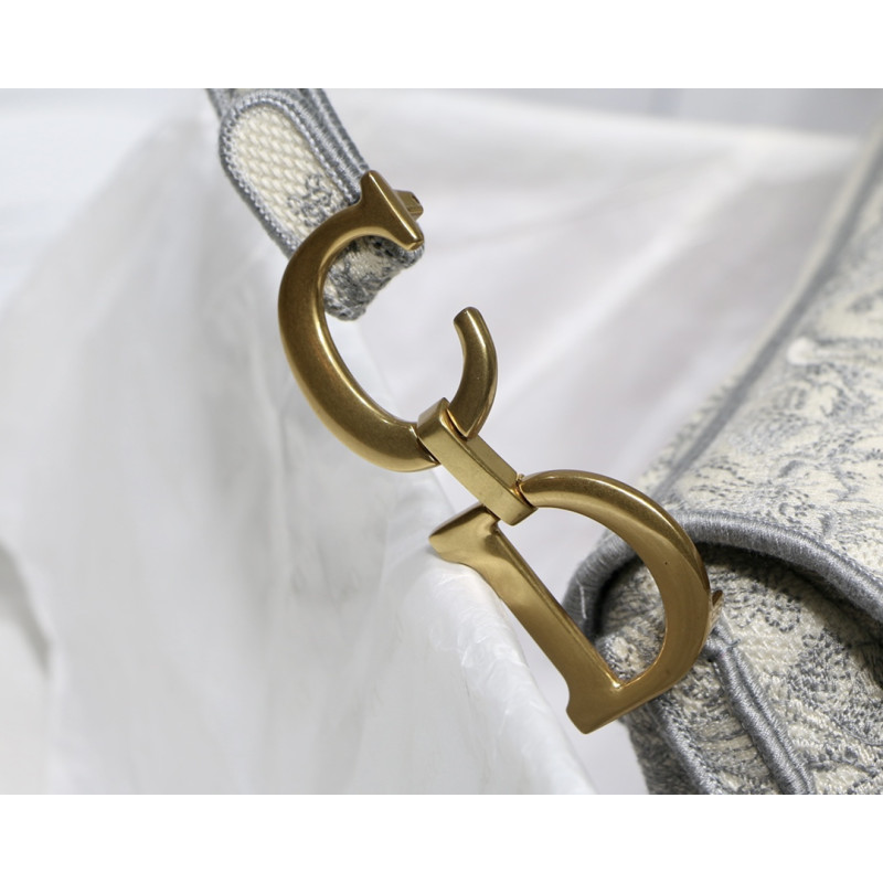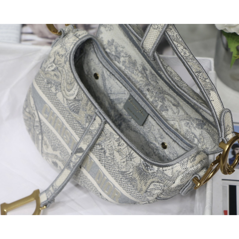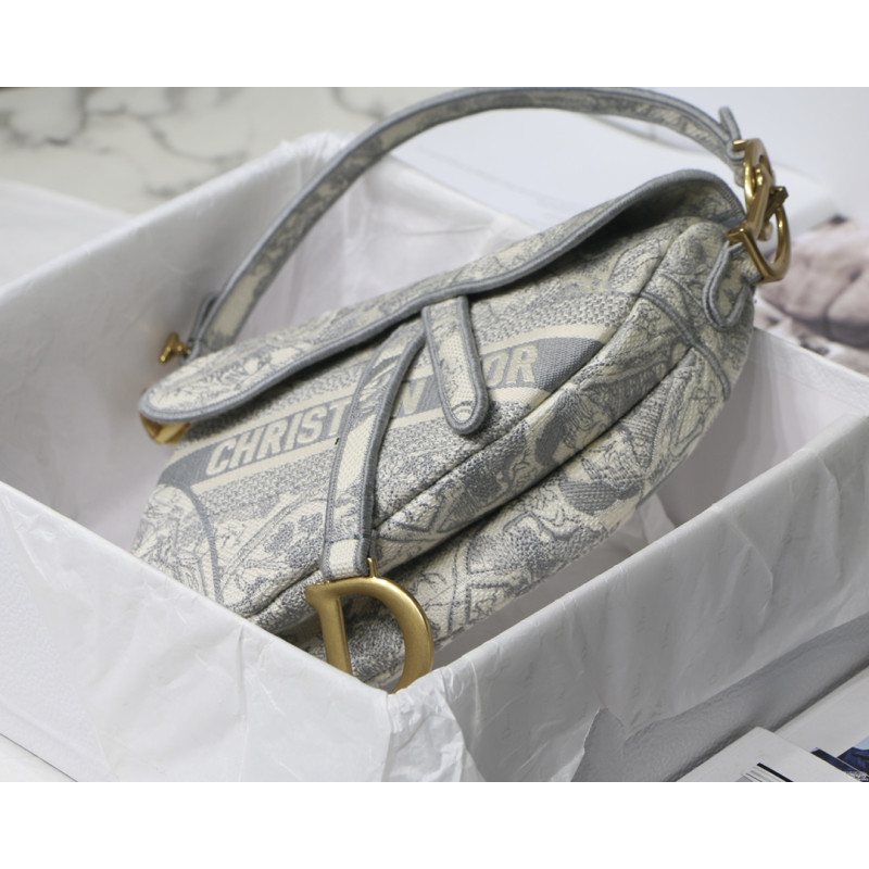 DetailEmbroidered with the Toile de Jouy motif, it reveals a saddle flap with a magnetic D-shaped stirrup clasp, as well as a CD signature in antique gold-finish metal on either side of the shoulder strap. This saddle bag has an adjustable and detachable spaghetti strap and can be carried by hand, over the shoulder or across the body.