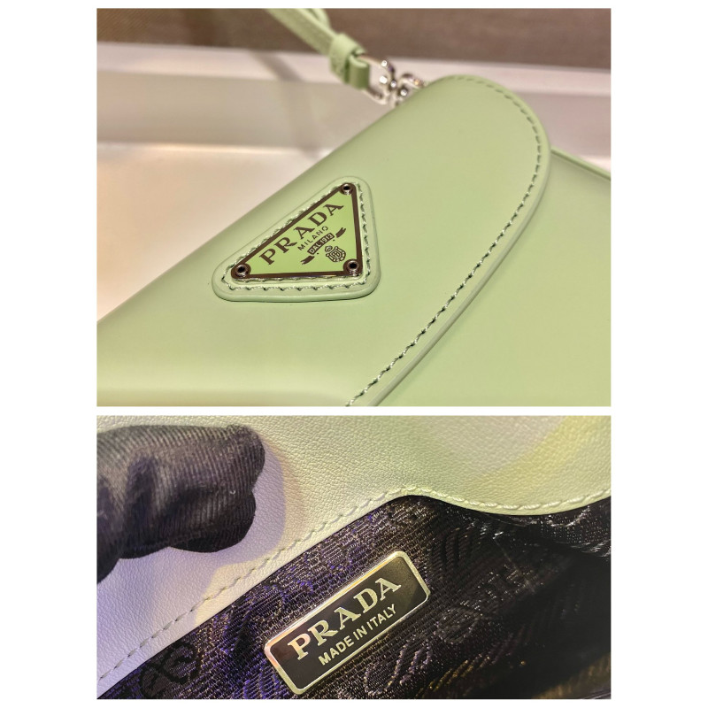 The special beveled structure of the bottom and sides of this flap bag emphasizes the smooth curved lines and gives it a sophisticated appeal, while the extended handles make it even more functional, allowing it to be worn as a shoulder bag or a tote. Brushed leather, unique to the Prada collection, is a modern, color-changing material perfect for new combinations and contrasts. A triangular enameled logo completes the silhouette.
