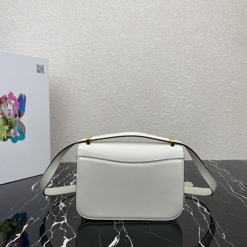 DetailStructured and classically designed in Saffiano leather, this shoulder bag is the brand's signature material, distinguished by its cross-scratch texture and waxed finish. The front is adorned with a triangular logo. Fitted with an innovatively designed handle and an adjustable shoulder strap, this piece is suitable for all occasions.