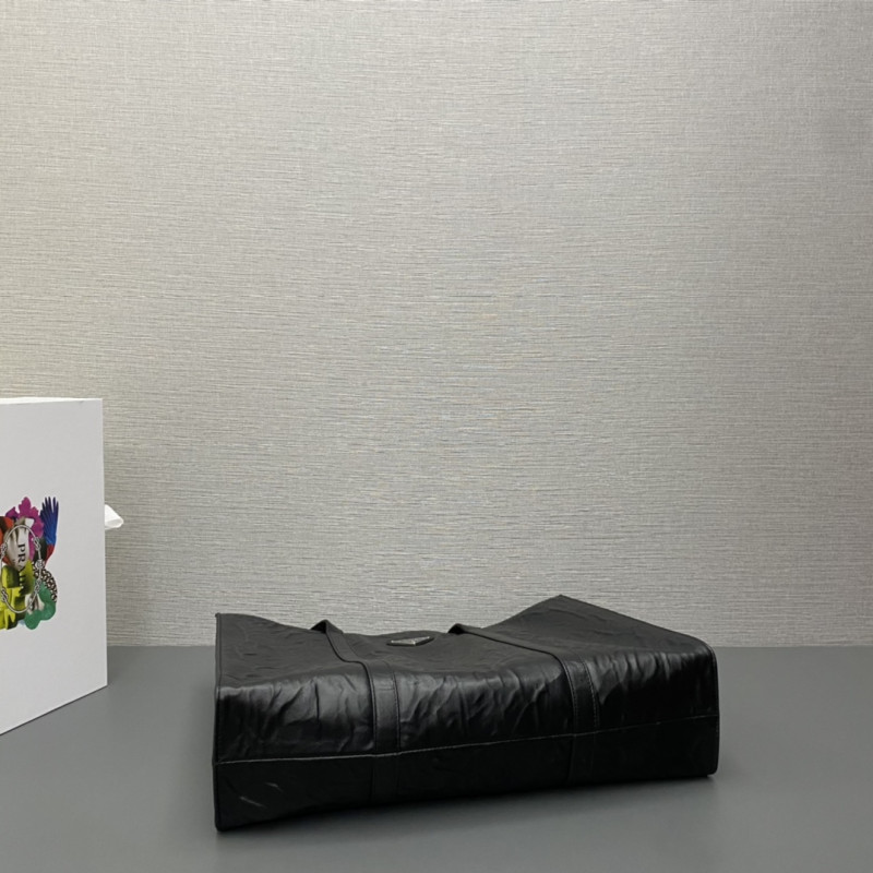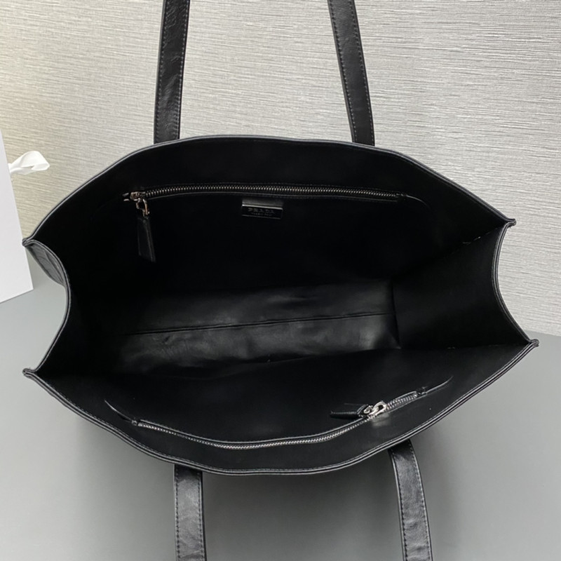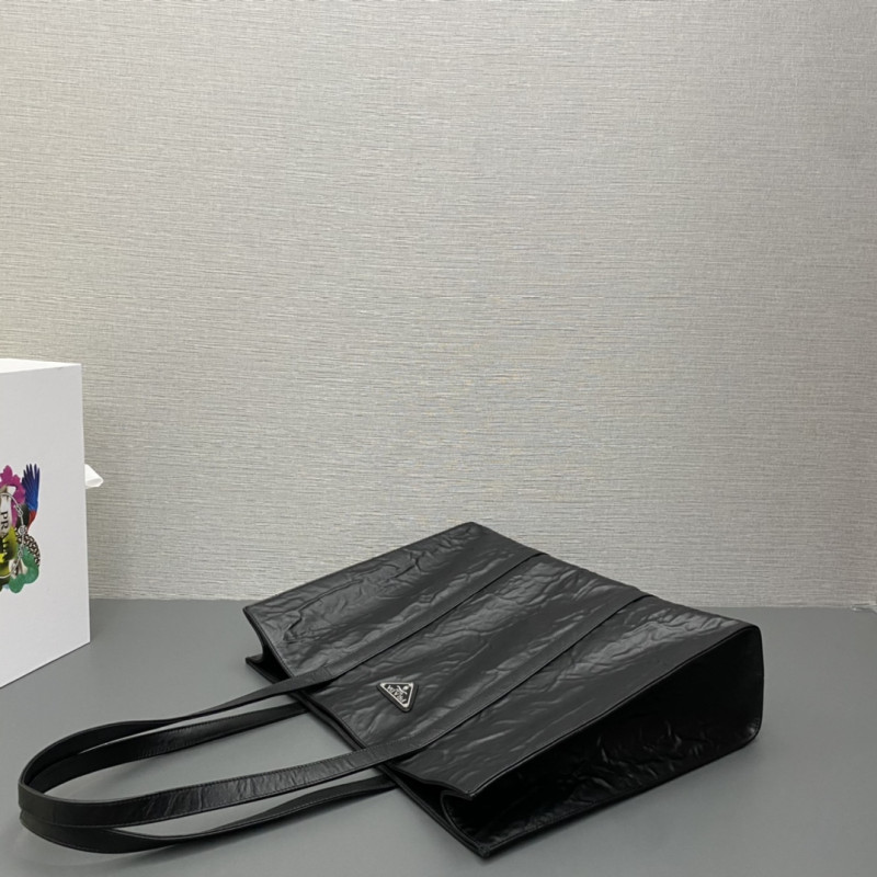 Crafted from natural glossy nappa leather, this tote bag has a casual, everyday appeal. The hand-crafted pleated effect contrasts with the concept of a rigid structure, reinterpreting an everyday item that can be worn casually. Finished with a triangular enameled logo.